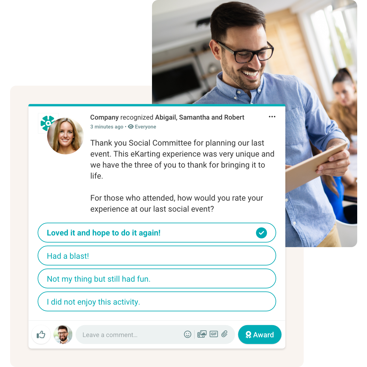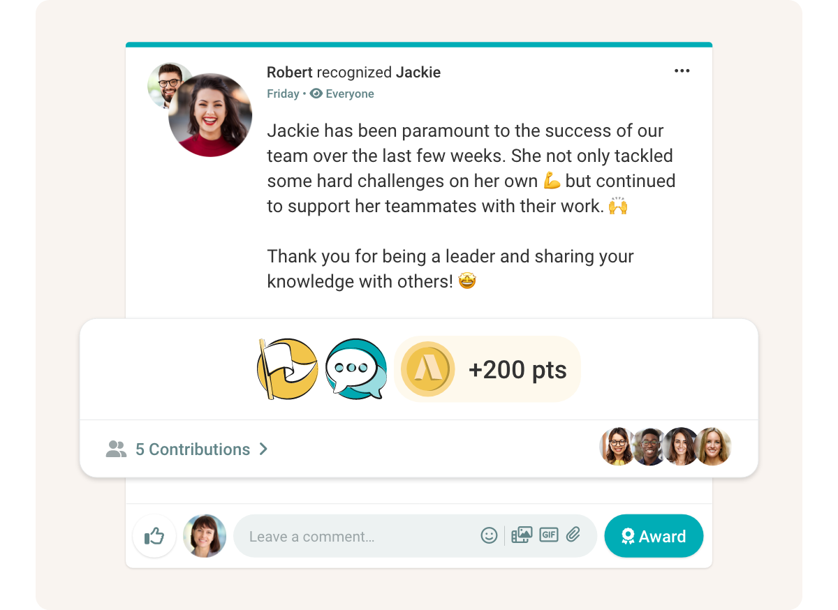 Take recognition to the next level with Augmented Awards. Award multiple badges and let others join in by giving points and badges of their own. Foster collaborative appreciation, boost team spirit, and maximize employee recognition.