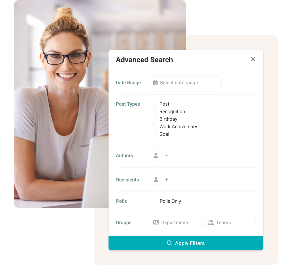 Discover a more efficient way to navigate the newsfeed with Advanced Search. Filter by date, type, authors, recipients, polls, groups, or departments.