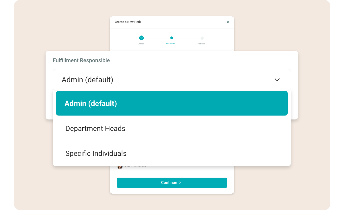 Now you can select who handles perk fulfillment when Perk rewards are redeemed. Empower Perk creators to choose program admins, department heads, or specific individuals for seamless and collaborative fulfillment.