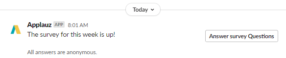 If your organization uses Applauz Pulse Surveys and have successfully integrated with Slack, all employees should receive notifications of any new pulse surveys directly within Slack.