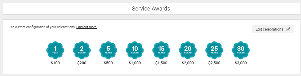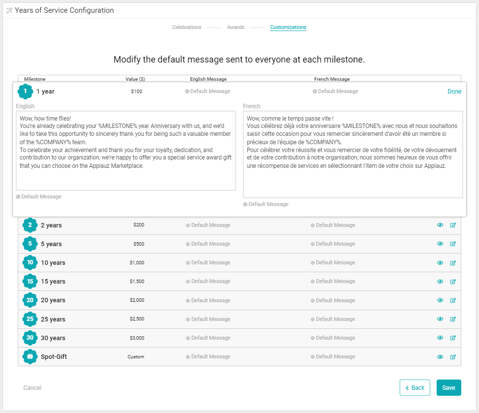Each milestone has a default message associated with it. In other words, this is the message that employees will see in their celebration email for their service award.