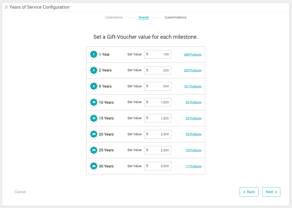 Applauz Service Awards works with "Gift-Vouchers." Gift-Vouchers act much like a gift card would, in that they're prepaid and denominations are pre-selected by the giver. You can decide how much to spend per participant, depending on which milestone they are celebrating.