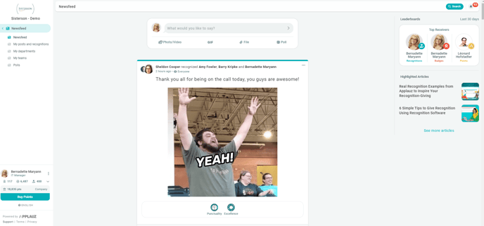 When you log into Applauz, the first thing you see is the Workplace. The Newsfeed is located in the menu directly below "Workplace" on the left-hand sidebar.