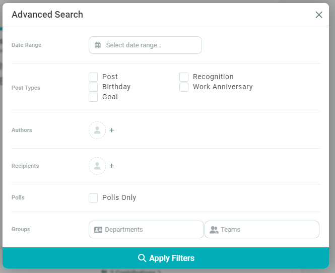 Select Filters: A popup will appear, allowing you to filter posts by Department or Team.