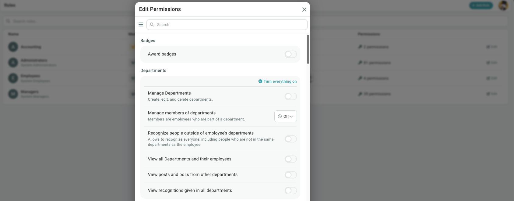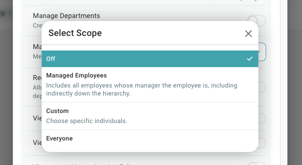 For example, let's say you turn on the "View employee list" permission for the Managers role. You now have three scope options:
