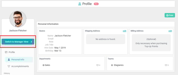 Once inside their Employee Profile, a Manager should see a button "Switch to Manager View."