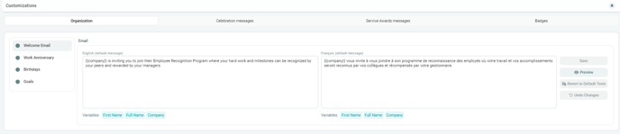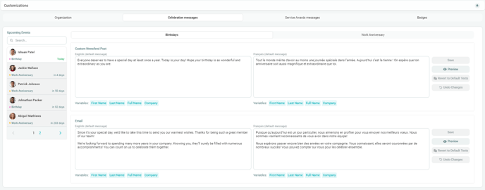 - In the middle panel, you can customize both the Newsfeed Post and Email messages for each event. Simply click inside the text boxes to edit the default messages in English or French.