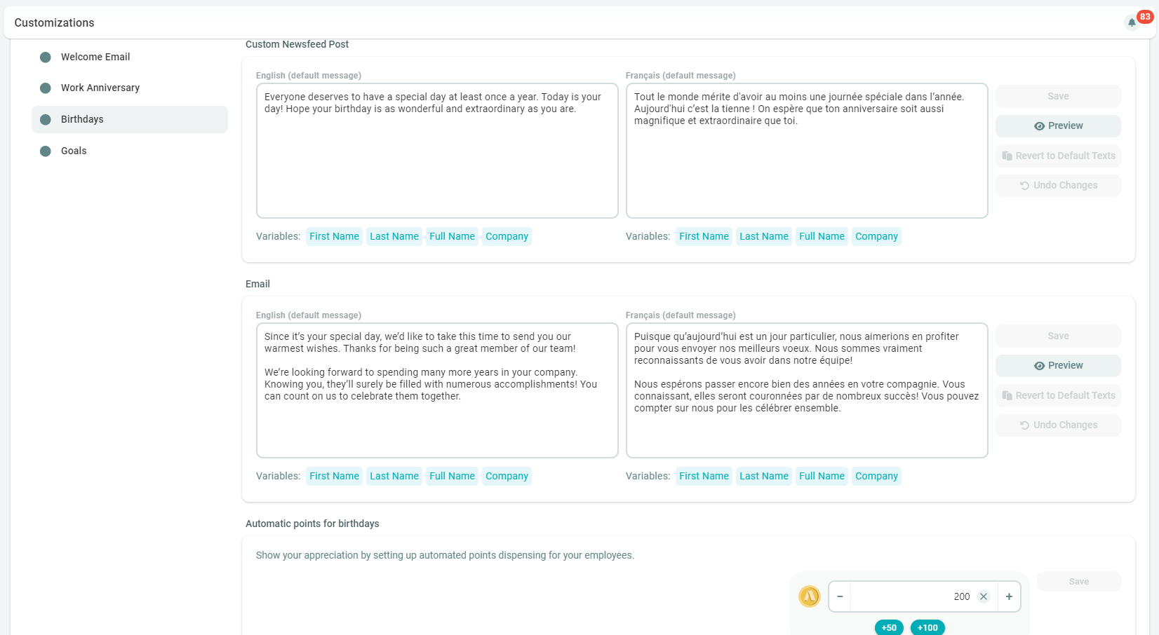 Under the "Birthdays" tab, you will find the fields to modify the celebration message and also a box to set automatic Points for birthdays.