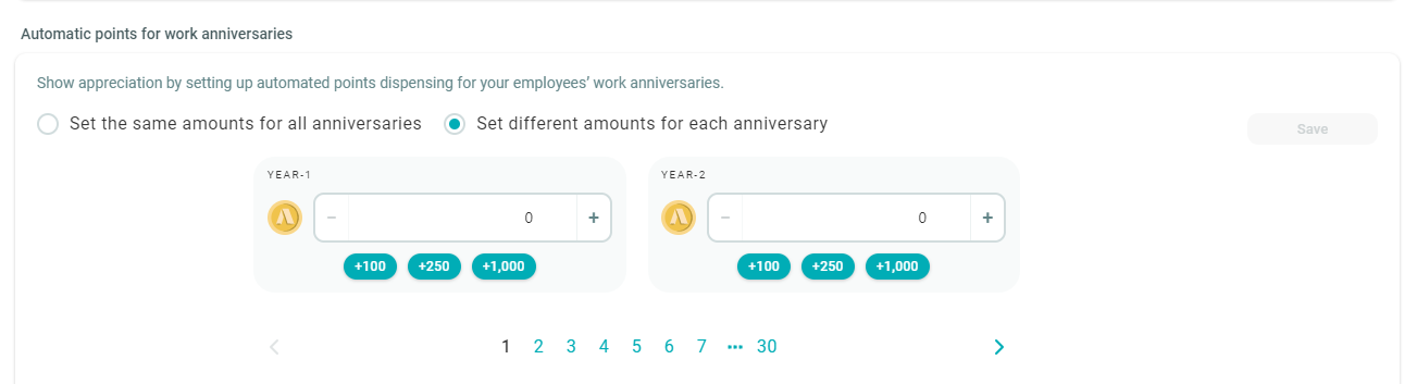 Here, you can set the number of Points to offer for all milestone anniversaries. Or alternatively, you can choose to set a unique number of Points for each milestone anniversary. For example, 200 Points for 1 year, 1000 Points for 5 years, etc.