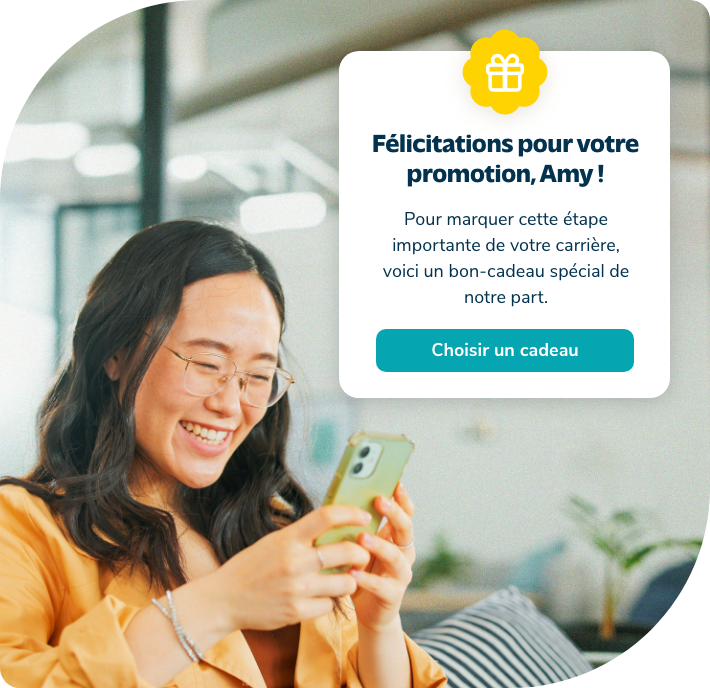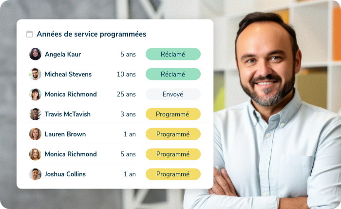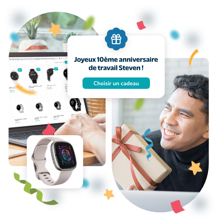 Nous vous aidons à mettre en place votre programme d'anniversaire de service, à établir un budget et à personnaliser les messages pour un démarrage réussi. Une fois le programme activé, les employés reçoivent des courriels de célébration à leur date d'anniversaire.