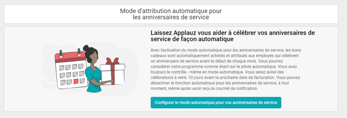 La dernière option est la plus pratique et la plus rapide. Elle est idéale pour les équipes des RH qui veulent réduire au minimum le travail administratif. Chaque mois, Applauz achète et attribue automatiquement des bons cadeaux aux employés qui célèbrent un anniversaire de travail ce mois-là. Votre compte sera également facturé automatiquement tous les mois pour les bons cadeaux. N'oubliez pas : nous vous avertirons toujours par courriel dix jours avant la date de facturation.
