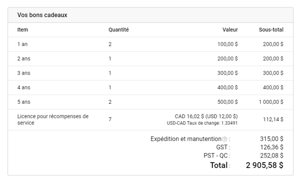 Remarque: chaque bon cadeau est accompagné d'une licence de 3 mois pour chaque employé célébré.