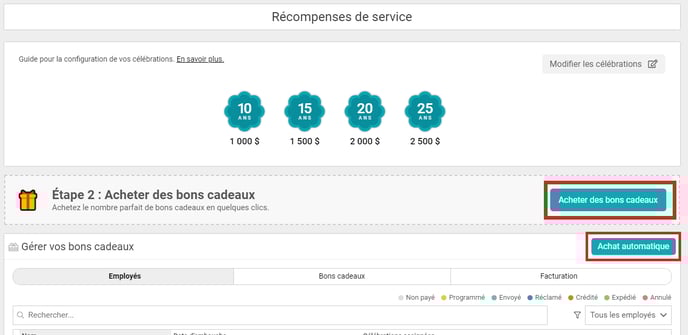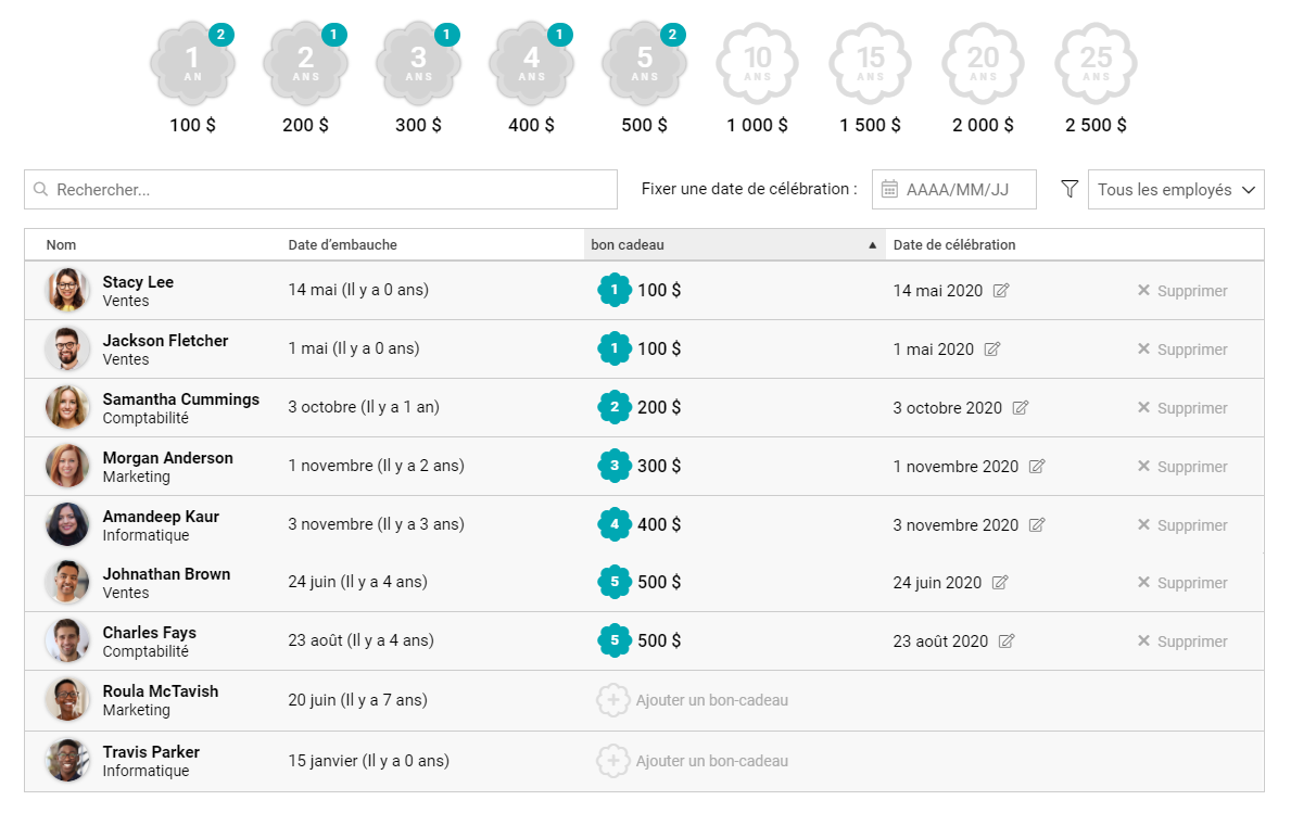 La sélection automatique des bons cadeaux est idéale si vous souhaitez célébrer plusieurs employés au cours de l’année. C'est également un outil idéal pour les grandes équipes, car il vous permettra de compléter automatiquement l'étape 2, soit l’attribution des bons cadeaux.