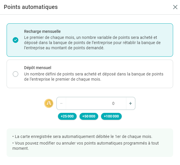 - Achat mensuel : Cette option signifie que 5 000 Points, par exemple, seront facturés et déposés dans votre Banque de l'entreprise sur une base récurrente chaque mois, indépendamment du nombre de points actuellement dans votre Banque de l'entreprise.