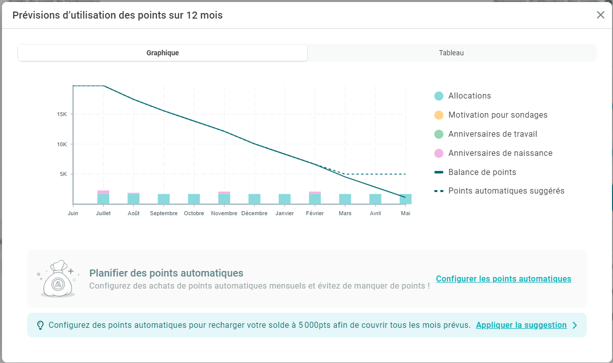 Gérer le solde de points de votre entreprise vient de devenir plus facile avec notre nouvel outil de prévision des dépenses de points. Cette fonctionnalité innovante est conçue pour fournir un aperçu complet des dépenses de points attendues par rapport au solde de la banque de votre entreprise, vous aidant à maintenir un budget sain pour vos programmes d'engagement des employés.