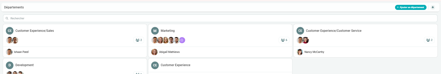 La classification de vos employés en départements est utile pour lancer des actions spécifiques aux départements, comme des sondages, des objectifs, des avantages. Ou pour offrir des points de reconnaissance à un département spécifique.