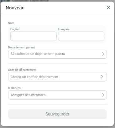 Pour ajouter un nouveau département, il suffit de cliquer sur le bouton "+Nouveau département" en haut à droite.