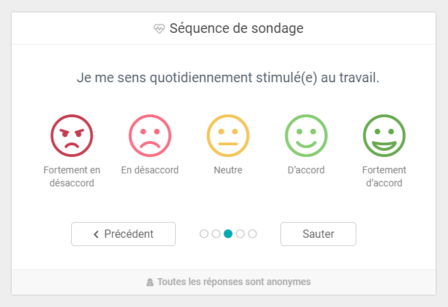 Pour que vous puissiez vous faire une idée précise du pouls de votre entreprise, vos employés se verront poser des questions randomisées sur tous les thèmes. Les questions relatives à l'eNPS sont prioritaires.