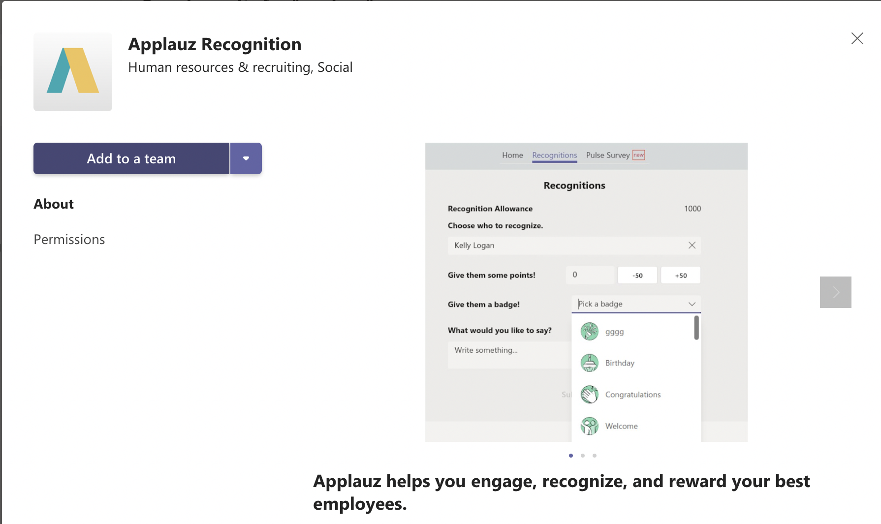 Les utilisateurs de MS Teams peuvent installer le bot Applauz comme application personnelle ou l’ajouter à une équipe. Le processus est relativement simple.