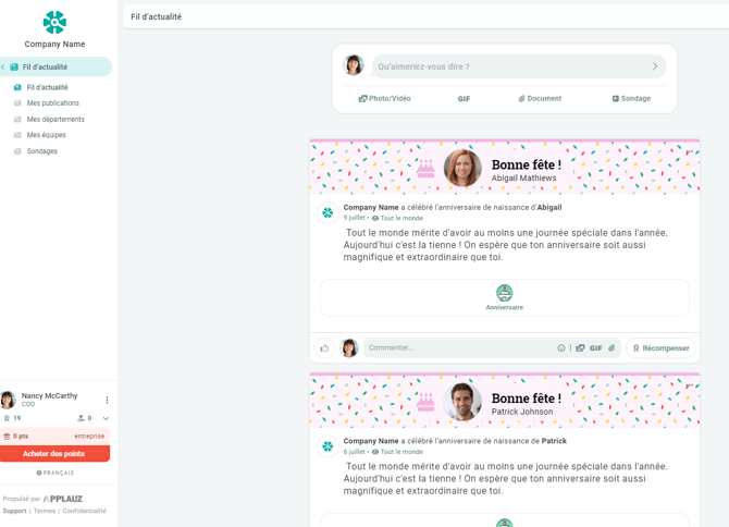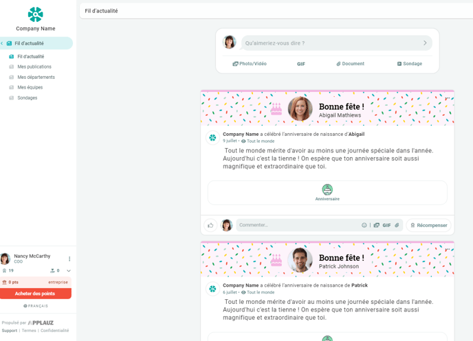 Lorsque vous vous connectez à Applauz, la première chose que vous voyez est le Lieu de travail. Le Fil d'actualité se trouve dans le menu directement sous "Lieu de travail" dans la barre latérale gauche.