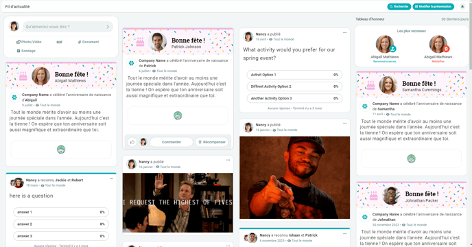Par défaut, toutes les publications sur le fil d'actualité sont affichées par ordre chronologique, les plus récentes étant en haut. Cependant, vous pouvez contrôler ce que vous voyez en filtrant les publications pour n'afficher que les départements ou équipes pertinents pour vous.