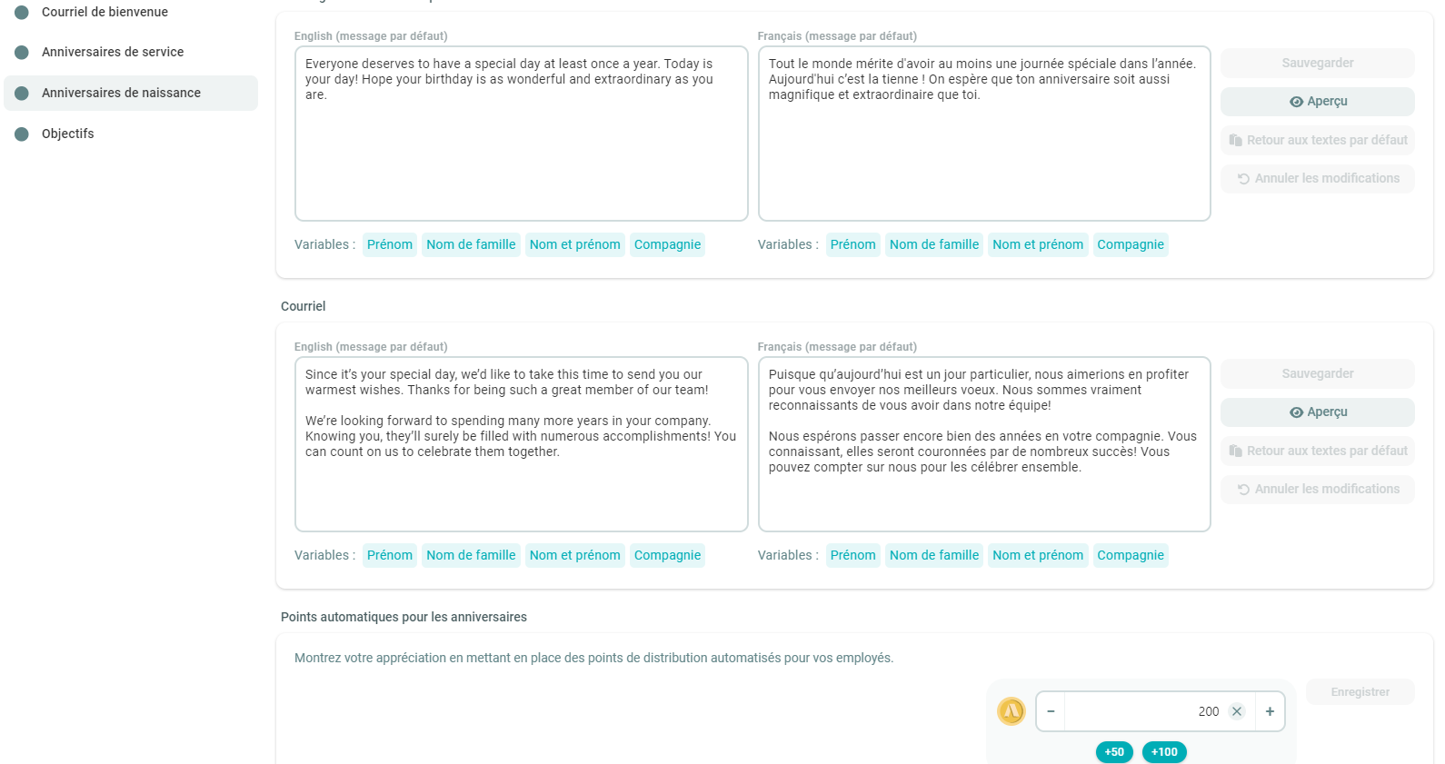 Ces points automatiques seront appliqués à toutes les célébrations des anniversaires des employés de votre entreprise. Les points seront déposés automatiquement dans la banque de points de vos employés le jour de leur anniversaire de naissance.