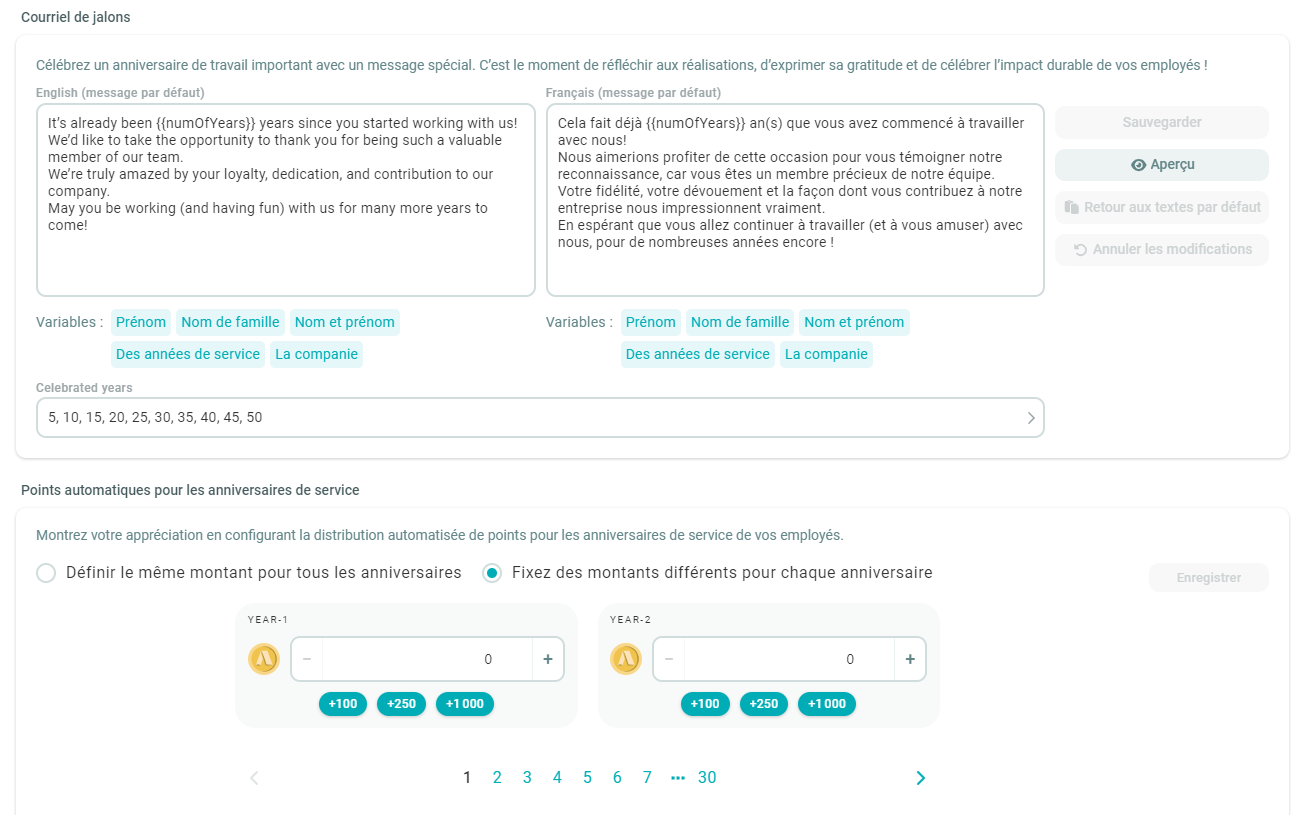 Sous l'onglet "Anniversaires de travail", vous trouverez les champs pour modifier le message de célébration et également une case pour définir des Points automatiques pour les anniversaires de travail.