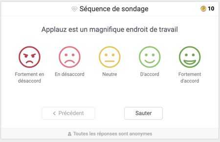 Les sondages éclair Applauz sont un outil qui aide les RH à sonder de manière anonyme les employés. Les questions sont pré-rédigées et envoyées automatiquement par Applauz chaque semaine. Tout ce que vous devez faire pour lancer les sondages éclair c’est d'activer la fonction !