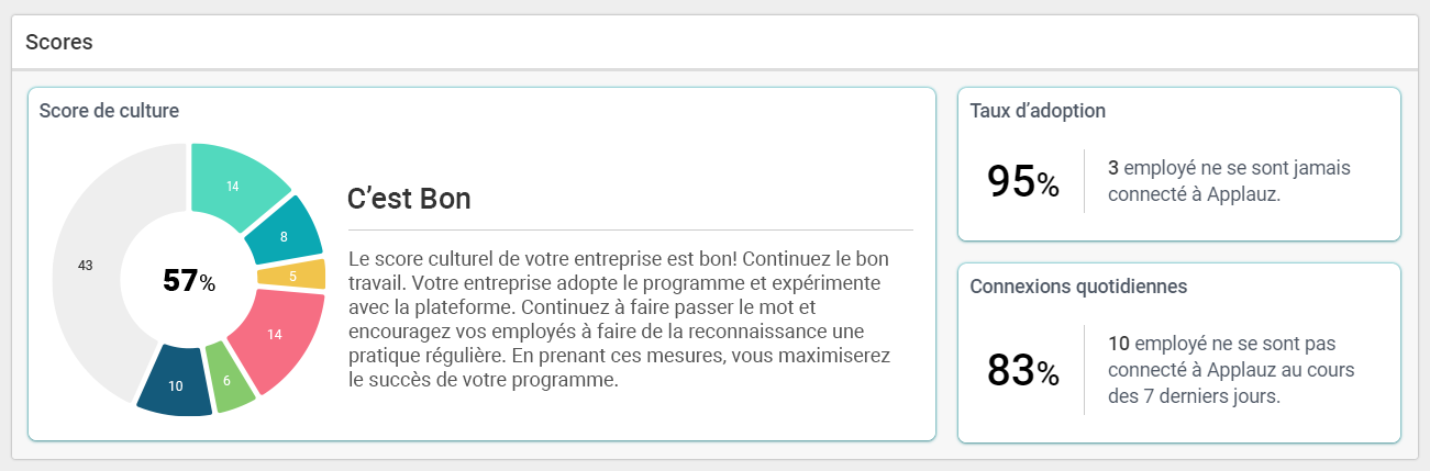 - Excellent: Vous avez atteint un score élevé! Vos employés et managers utilisent les fonctionnalités d'Applauz à leur plein potentiel.