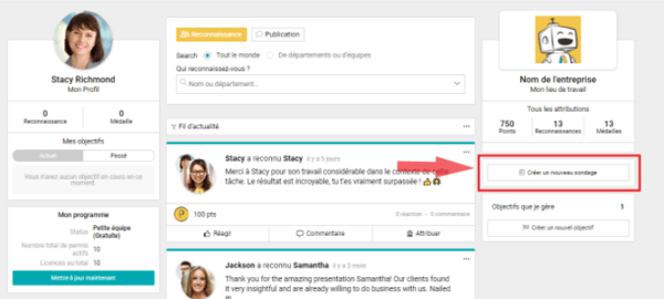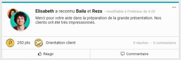 Ainsi, si vous remarquez que certains employés ne participent tout simplement pas, ne les poussez jamais d'une manière qui ne soit pas naturelle ou qui vous mette mal à l'aise. Rappelez plutôt à tous les employés que même s'ils ne se sentent pas encore à l'aise pour offrir une reconnaissance, ils peuvent toujours "réagir" à l'activité du Newsfeed en "aimant" ou en faisant des commentaires. Ces petits coups de pouce aideront les employés à se familiariser avec le programme.