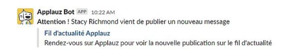 Si votre entreprise utilise déjà slack comme outil de messagerie instantanée, vous pouvez facilement l'intégrer à Applauz. L'intégration d'Applauz dans votre espace de travail Slack permettra à vos employés de rester informés de ce qui se passe sur Applauz. Chaque fois qu'une action est effectuée sur Applauz (un nouveau poste, une reconnaissance ou un sondage), une notification apparaîtra dans le canal Slack que vous avez choisi avec un lien pour visiter Applauz.