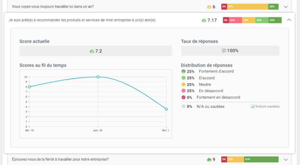 - Par exemple, vous pouvez remarquer que la question « Mon/ma gestionnaire me fait confiance et n'interfère pas dans mon travail. » obtient un score beaucoup plus bas que les autres.