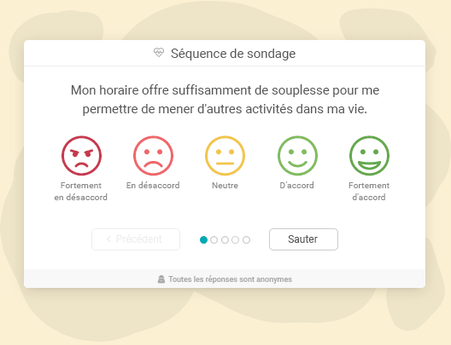 Si votre entreprise a obtenu un faible score sur ce thème : il est probable que vos employés se sentent dépassés, stressés ou épuisés par les exigences de leur travail. Le plus important, c'est de comprendre pourquoi vos employés rencontrent des difficultés et de trouver des solutions adaptées.