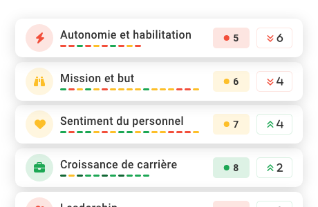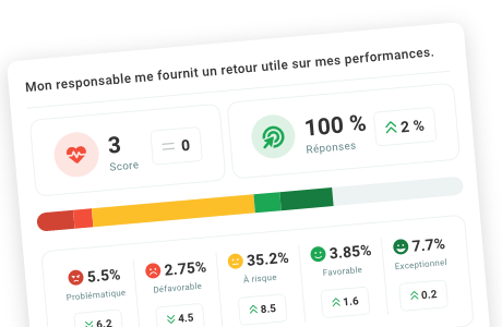 Nous vous guidons dans la personnalisation des thèmes et des questions de vos sondages éclair afin qu'ils correspondent précisément à vos objectifs en matière de ressources humaines. Les sondages éclair sont conçus pour s'adapter facilement aux besoins changeants de votre personnel, avec des dizaines de thèmes prêts à l'emploi et des centaines de questions scientifiquement étayées, disponibles à l’envoi.