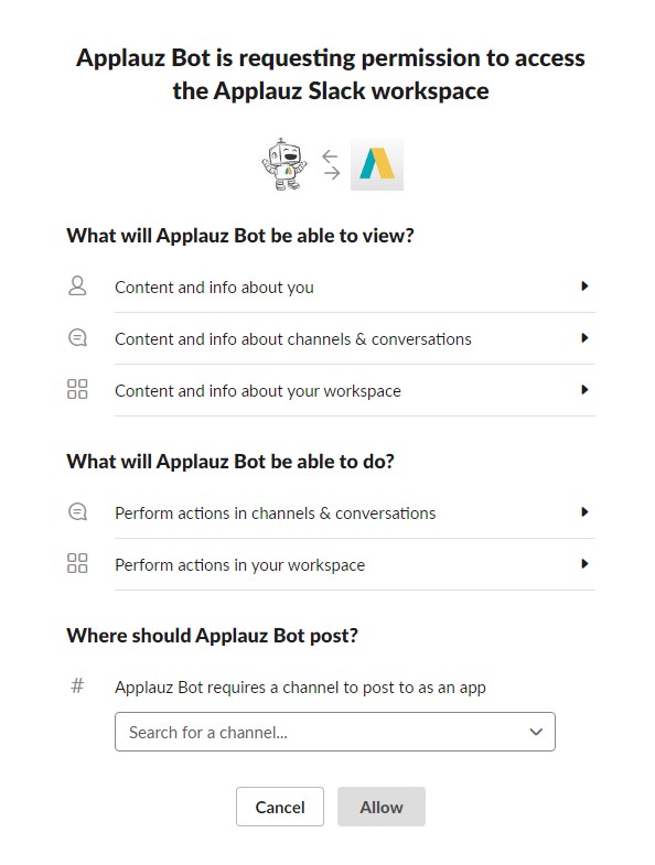 2. Select the desired Slack channel for Applauz to post notifications to.