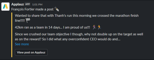 Integrating Applauz with Slack bridges the gap between recognition and communication, seamlessly enhancing employee engagement within your digital workspace. By adding Applauz to Slack, you unlock a world of real-time recognition and feedback, fostering a culture of appreciation and connectivity. This simple integration not only elevates employee morale but also aligns seamlessly with your team’s daily communications, making recognition an integral part of your workplace culture. Let's get started: