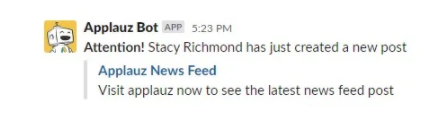 If your company already uses slack as an instant messaging tool, you can easily integrate it with Applauz. Integrating Applauz into your Slack workspace will allow your employees to stay updated on what's happening on Applauz. Whenever an action is performed on Applauz (a new Post, Recognition, or Poll), a notification will appear in a chosen Slack Channel with a link to Applauz. Seeing a notification pushes employees to click through and visit Applauz, naturally improving your Culture Score.
