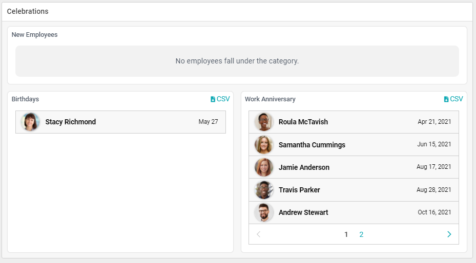 Why it is useful: We suggest checking up on this section regularly to see who is celebrating an upcoming work anniversary or birthday. This way, you can plan a small party or something special for your team members celebrating a special day.