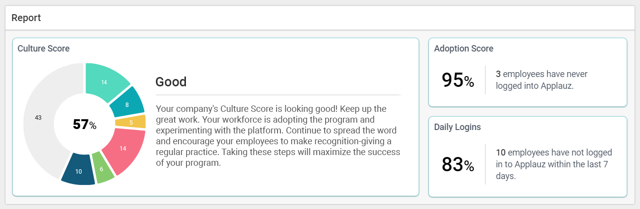 Why is it useful: Your company's overall culture score is an excellent indicator of the program's success. If it's low (a score of 50% or below), it means there is potential to get more people involved with the program. It would be best if you always aimed to improve your Culture Score. Note that each employee also has an individual Culture Score, which can be viewed on the Employee's Profile.