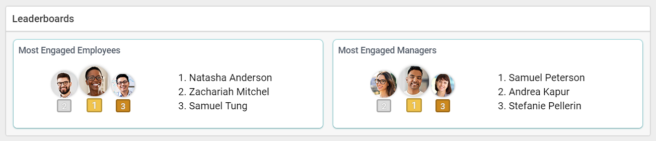 The Leaderboards dashboard is found right under the Culture Report dashboard. This dashboard will show you the top three most engaged employees on Applauz and the top three managers. “Engaged” refers to their level of participation within the program.