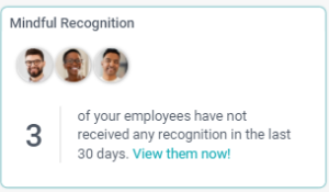 The Leaderboard shows you the team members who are leading recognition efforts. In other words, here, you will see which employees are giving the most recognition to their peers. Simultaneously, the Mindful Recognition section shows you which employees have not received recognition in the last 30-days.