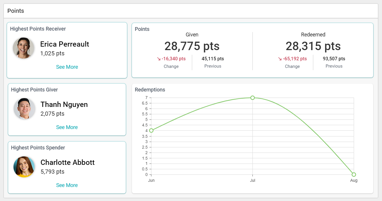 You'll find the "Redemption and Rewards" reports on the side panel of the main reports menu. You will want to keep an eye on this report if your program uses Applauz Points. That said, the Points dashboard tells you if your company's employees are using Points (by awarding them to each other) and, most importantly, if they are redeeming those Points for rewards from the Applauz Marketplace.