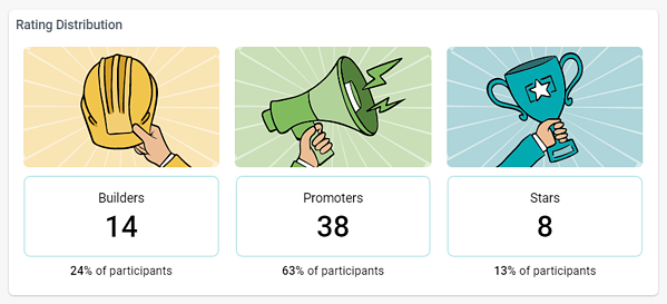 The first dashboard available in the Culture Report is the “Ratings” dashboard. This rating system breaks down your program participants into three categories: Builders, Promoters, and Stars. These categories are based on the program participation level of each employee. The Stars are those employees with the highest participation on Applauz and Builders with the lowest.