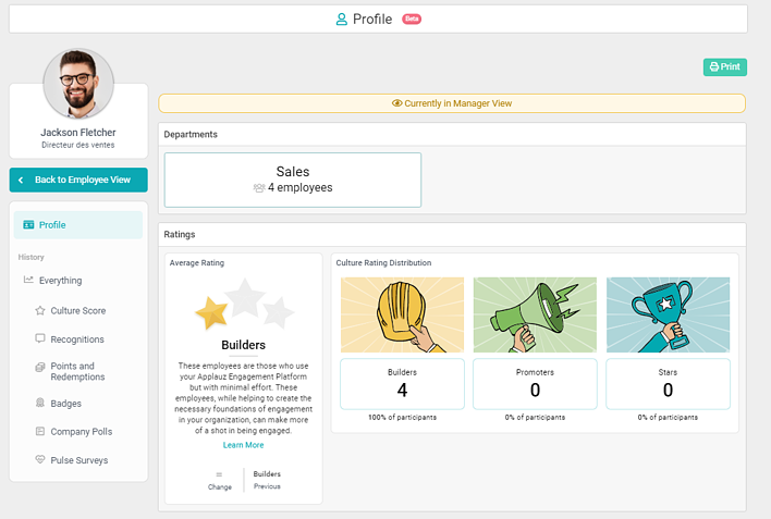On the side panel of the Department View, you will see the section called “Profile.” Under Profile, you can find the Ratings Dashboard. This dashboard shows managers where their employees fall within each category: Builders, Promoters, and Stars.