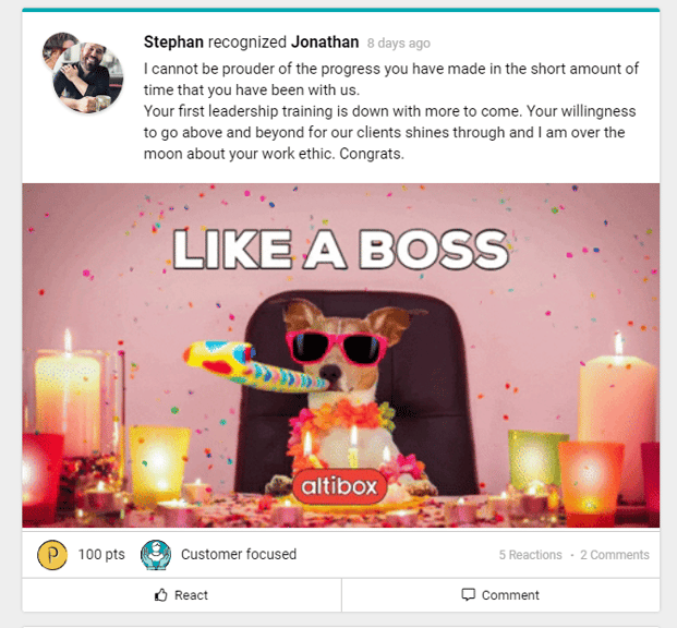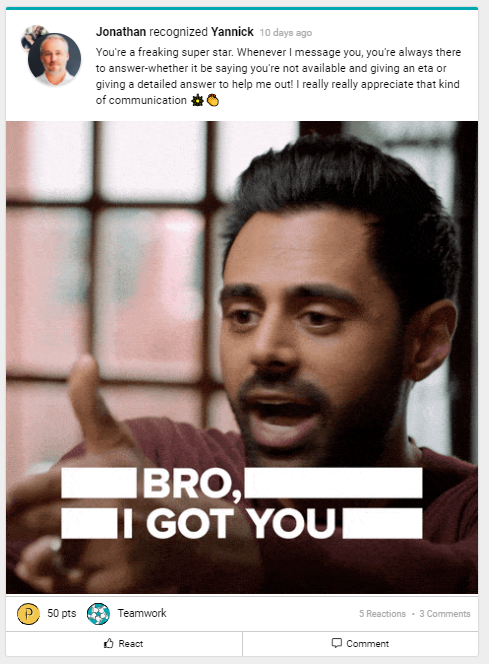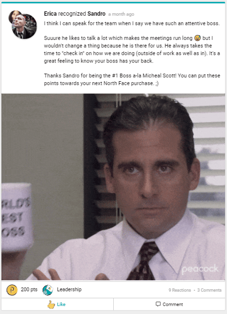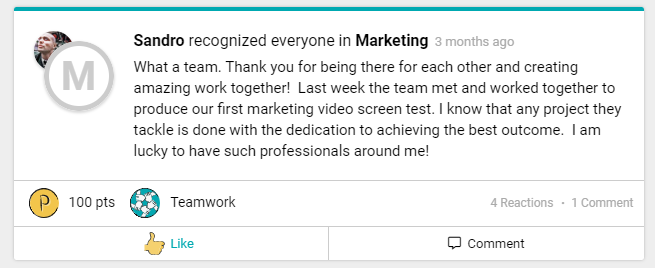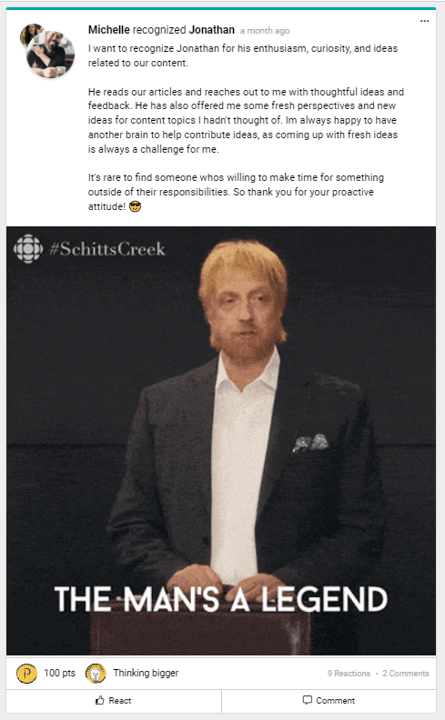 But we also believe that for a recognition program to truly flourish, everyone needs to feel valued – this includes managers and leaders. That's why we love to see bottom-up recognition on our newsfeed.