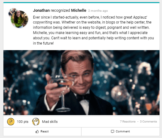 To inspire you to start giving different types of recognition, we are letting you behind the curtains to see the Applauz team's newsfeed and how our employees give each other recognition. We hope that it will inspire you to do the same!